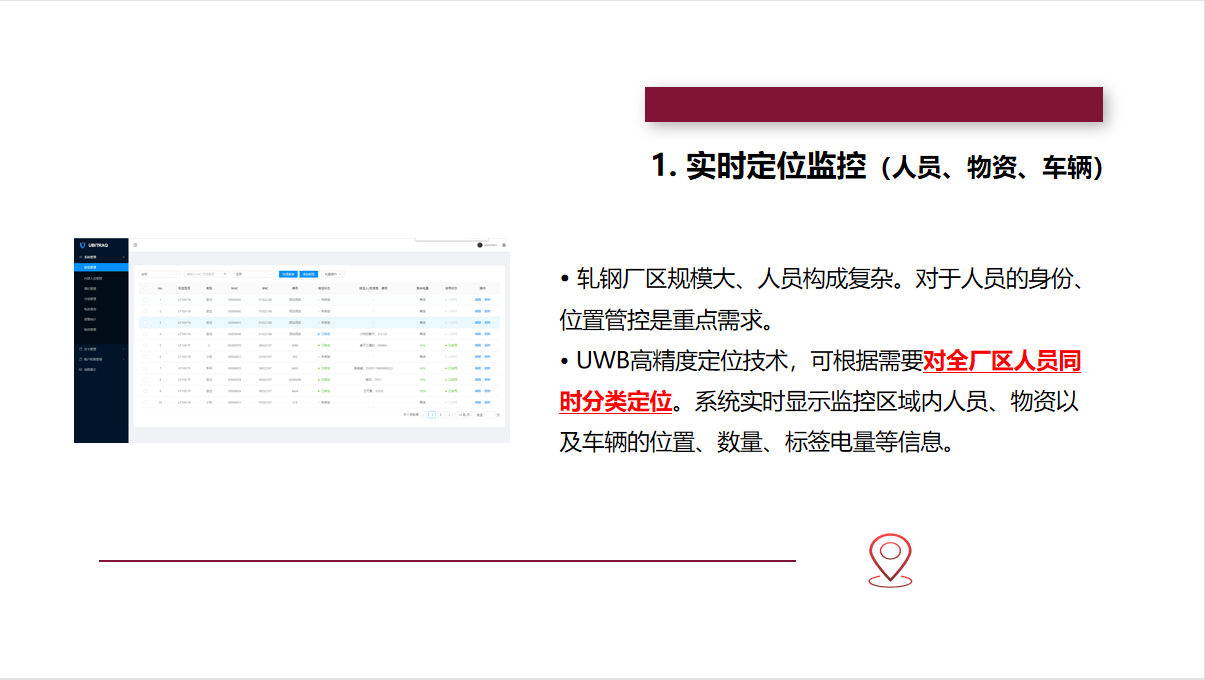 标签:待定位的人员、资产上须佩戴室内定位标签。标签发射UWB信号,与基站相互通信,使标签自身被定位。