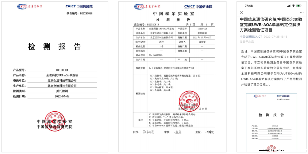 中国信息通信研究院/泰尔实验室完成了对全迹UWB-AOA产品的检测验证,并在其官方微信公众号上推荐。