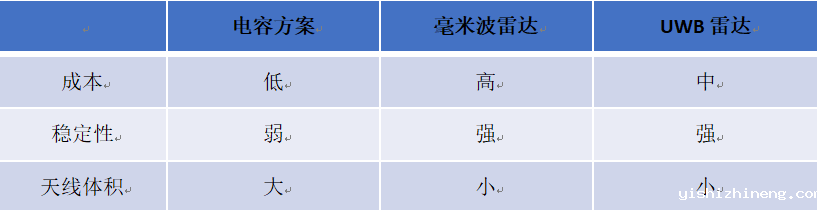 毫米波雷达是一种备选替代方案,通过对毫米波雷达回波的分析,可以有效检测踢腿的动作。并且毫米波不受周边电磁环境的干扰,雨水的影响也不大。目前车载毫米波脚踢尾箱雷达最大的问题是价格较昂贵(相比电容方案和UWB雷达方案)。UWB雷达提供了另一种选项。稳定性足够高(相比电容方案),成本适中(比电容方案贵,比毫米波方案便宜),低功耗(低于毫米波雷达)。