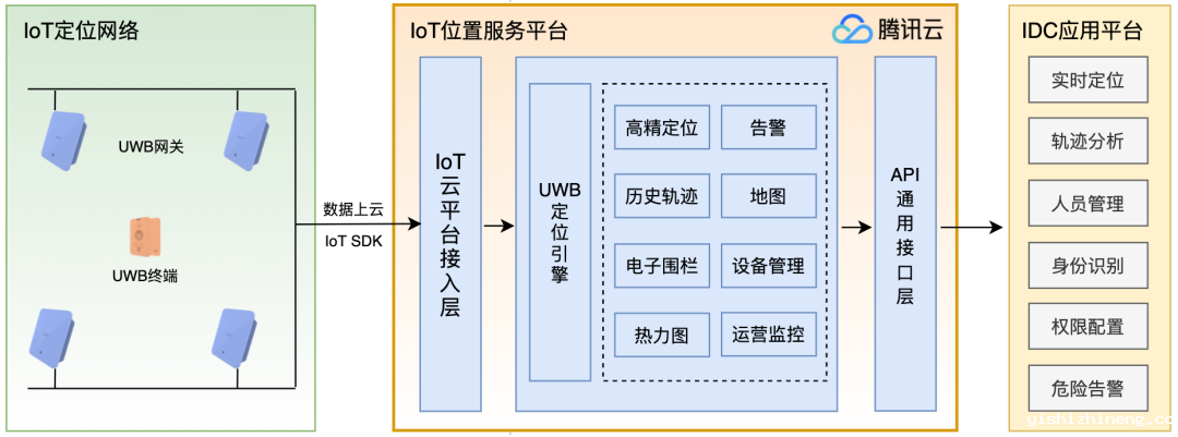 云化UWB高精度定位智能管控系统主要包括两个模块,即 IoT UWB定位网络、IoT位置服务平台,通过API通用接口层与上层的IDC应用平台交互,如下图所示: